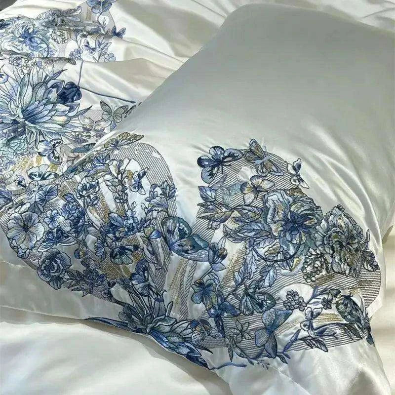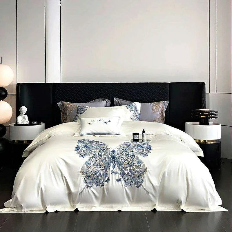 Luxurious Butterfly Embroidery Satin Silk Cotton Bedding Set - Silky Brocade Duvet Cover, Bed Sheet & Pillowcases (4 Piece Collection)