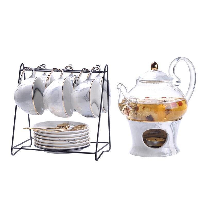 - Complete Set: Includes 1 teapot, 1 candler, 6 cups, 6 saucers, 6 gold spoons, and 1 holder.