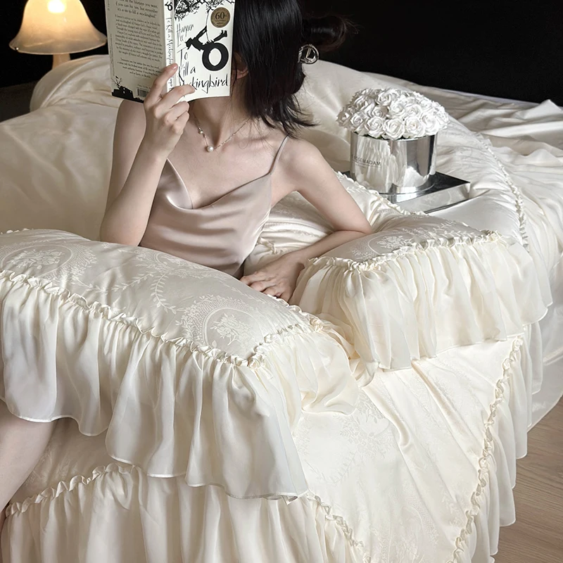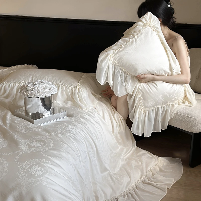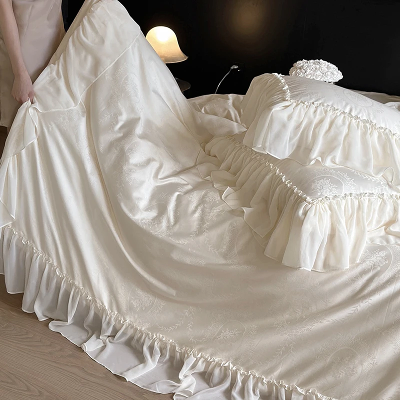 - Elegant Design: The intricate jacquard pattern, complemented by delicate chiffon lace accents, exudes sophistication and transforms any bedroom into a stylish retreat.