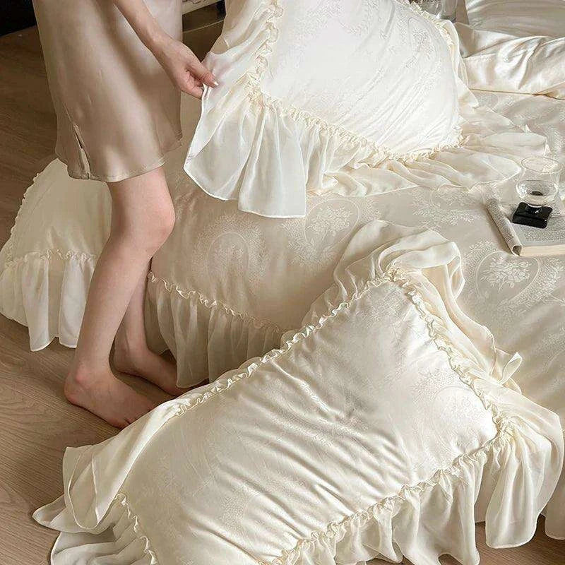 Luxurious Jacquard Lace and Chiffon Bedding Ensemble with Premium Egyptian Cotton - Beige Ruffled Duvet, Sheets, and Pillowcases