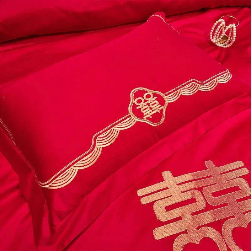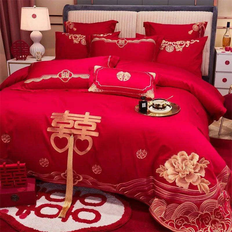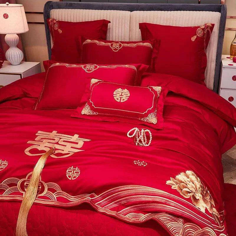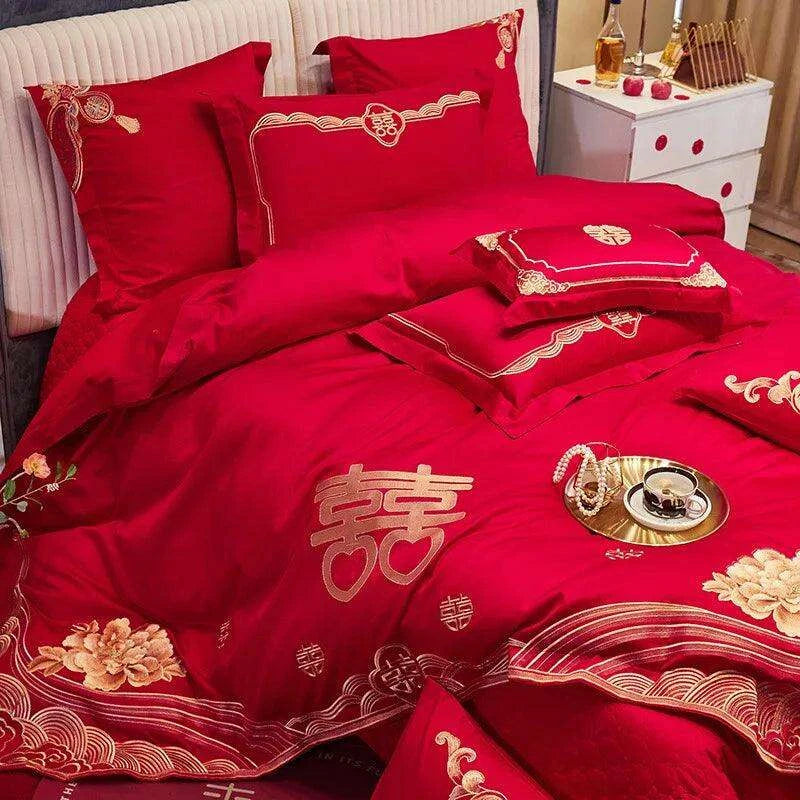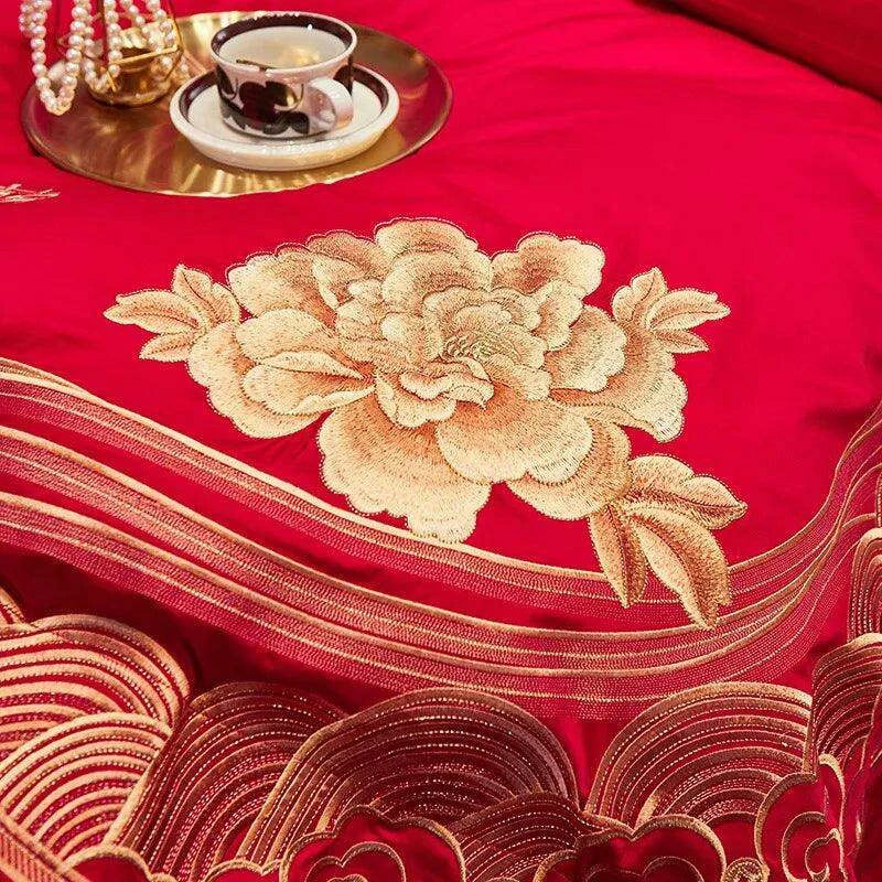 Luxury Red Chinese Wedding Duvet Cover Set with Elegant Golden Floral Embroidery and Premium Pillowcases