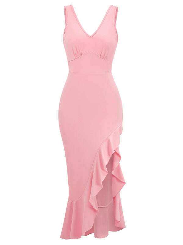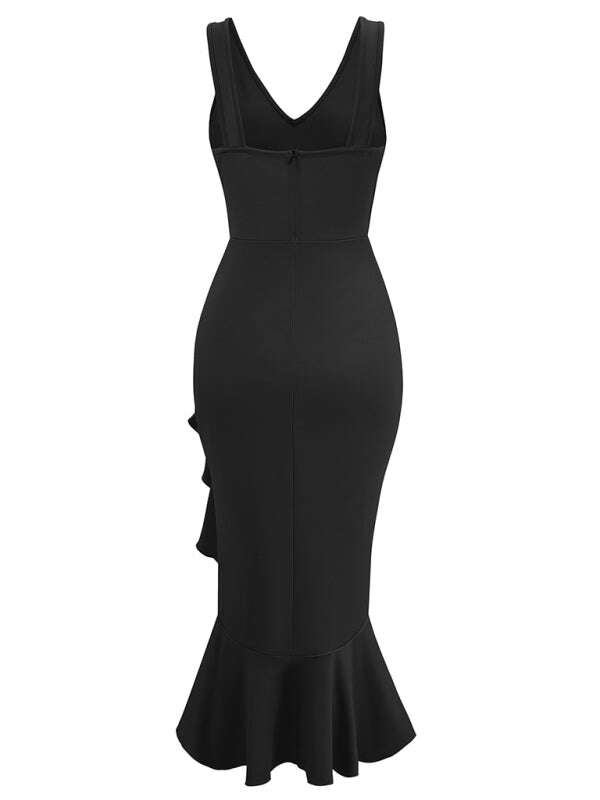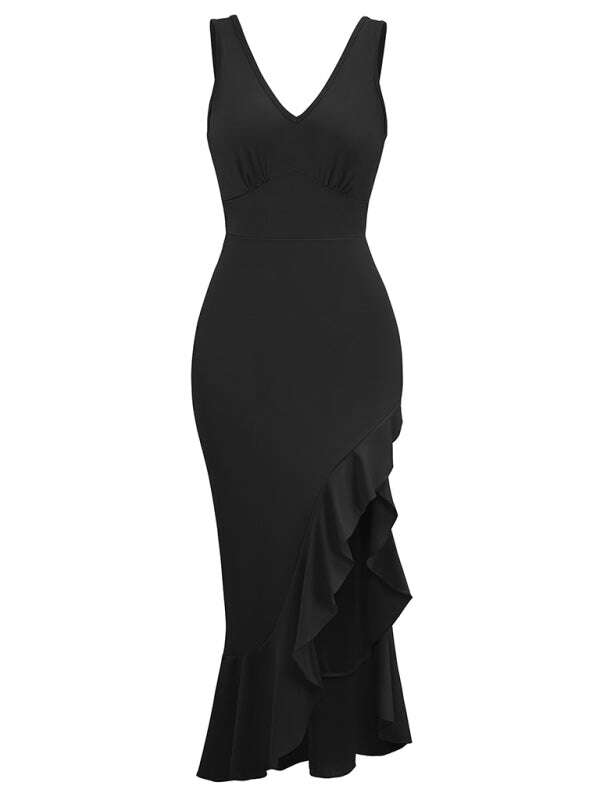 This dress features a V-neck design, creating a sexy and elegant atmosphere. The ruffled hem can increase the romantic and feminine feel of the dress, adding a soft and gentle element to the overall look.