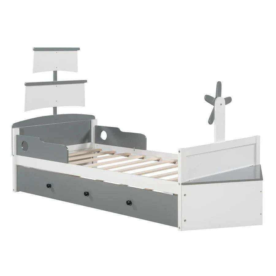 Transform your child's bedroom into a thrilling racing adventure with our Race Car-Inspired Twin Bedroom Set. This set not only provides a comfortable sleeping environment but also showcases a unique design that stands out from conventional furniture. Crafted from durable white and gray pine wood, this set combines functionality with a playful aesthetic.