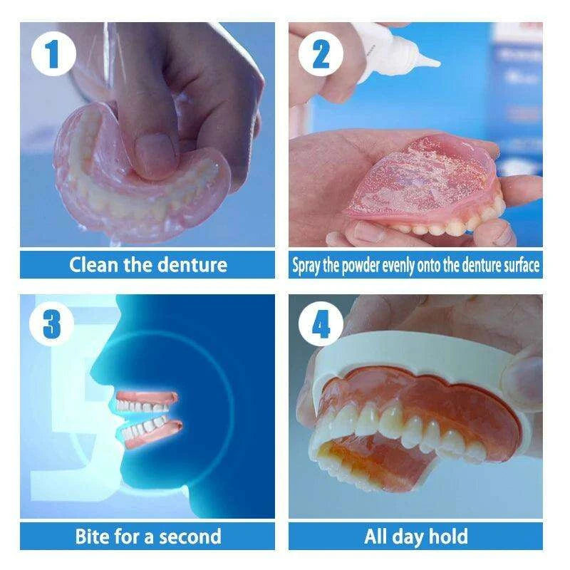 Applying: Clean your denture(s) and leave them wet. Lightly and evenly spray powder onto the surfaces that contact your gums or the roof of your mouth. Press firmly into place, hold, and bite down for a few seconds to ensure secure adhesion.