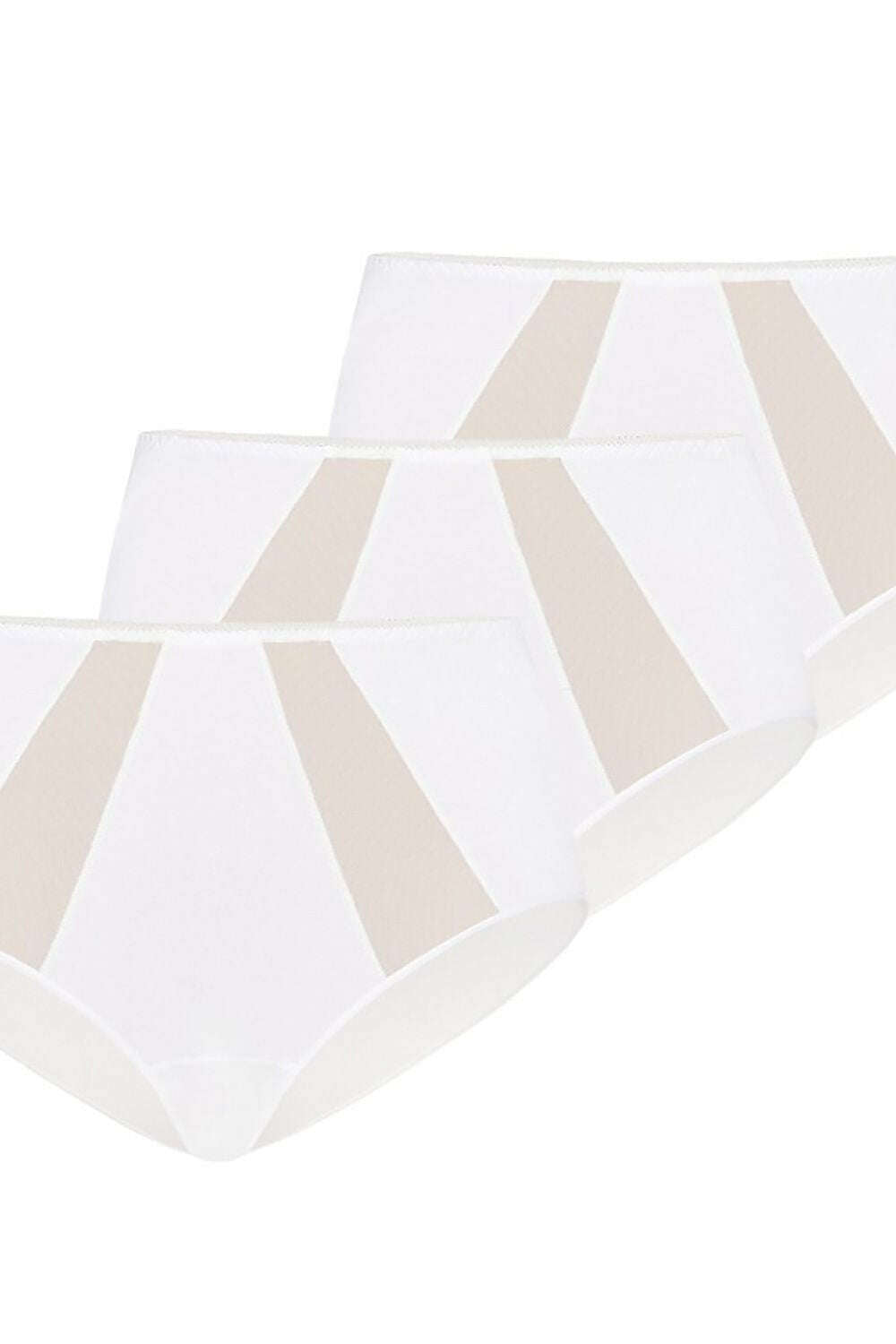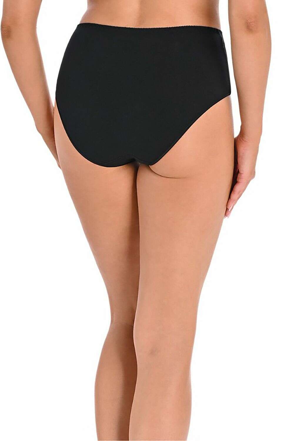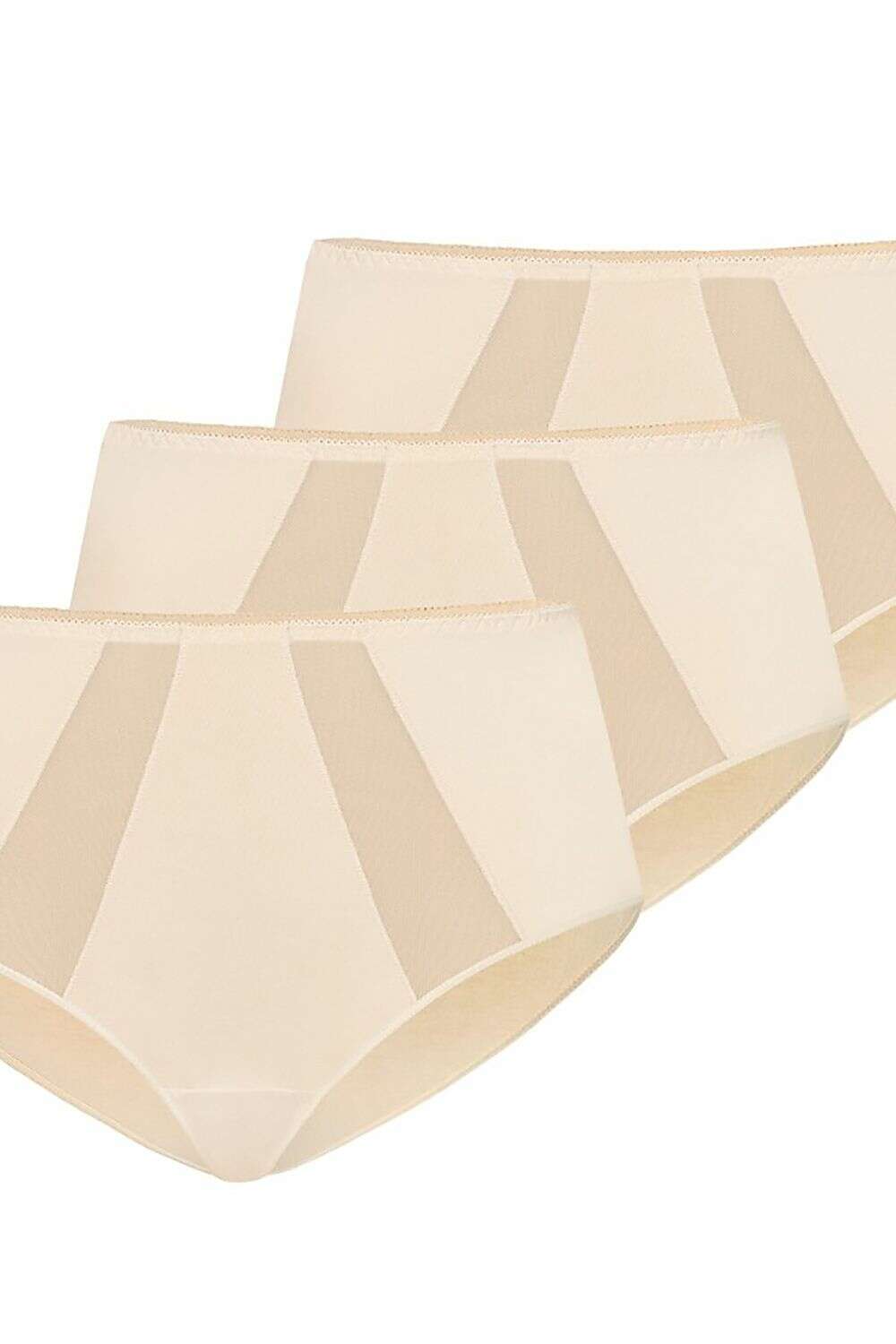 The high-rise cut reaches the middle of the navel to help smooth the tummy and sides, while the back provides full coverage for a flattering, secure fit. In the front, decorative mesh inserts on both sides feature a thin, see-through, delicately woven mesh sewn diagonally vertically, creating a slenderizing visual effect without compromising comfort. A soft elastic waistband sits lightly at the waist, not leaving marks, and the same soft elastic is used around the thighs for a comfortable, secure fit.