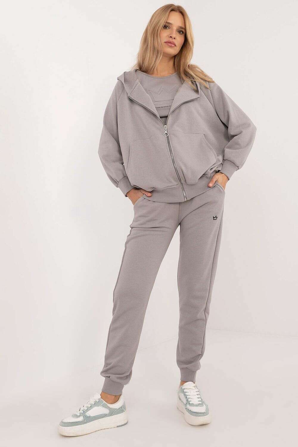 Women's casual style sweatshirt set, ideal for both casual outings and sports activities, consists of a T-shirt, sweatshirt and pants. The set has a plain pattern, which gives it a versatile character, and the dominant material is a soft and durable blend of cotton and polyester for comfort and breathability. The pants have long legs finished with ribbed cuffs and a high rise, which accentuates the silhouette and gives full freedom of movement. There is an elastic waistband for a perfect fit. In addition, the pants have side slip pockets, which are practical and functional. The long-sleeve, zippered sweatshirt features slip-in pockets and a hood for added sporty style and protection from the cold. The T-shirt with a classic round neckline is the perfect complement to the set. This set is a combination of comfort, functionality and style, perfect for every day and sporty activities.