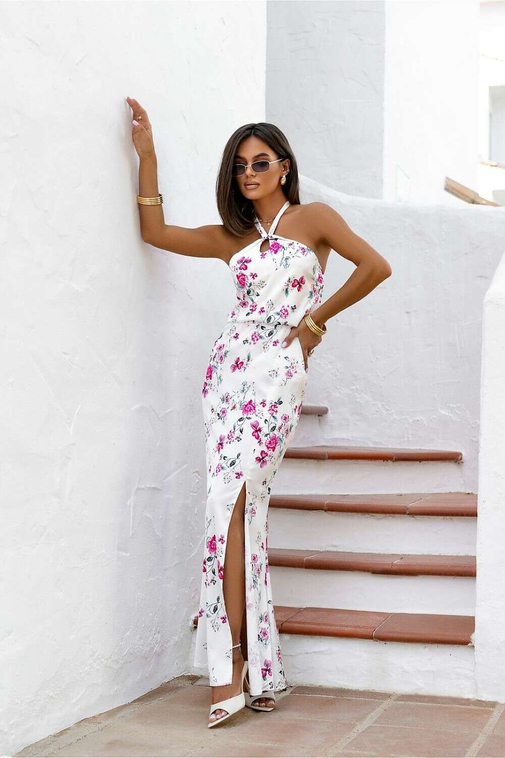 Elegant and sensual women's set made of delicately shimmering satin, perfect for special occasions or summer evenings. The blouse tied at the neck subtly exposes the shoulders and neckline, while the inserted elastic at the back ensures a comfortable fit to the silhouette. The long skirt with a striking slit up to mid-thigh adds lightness and feminine charm, emphasizing the legs in motion. This set is a combination of class and modern style, a great option for a date, party, or summer event.