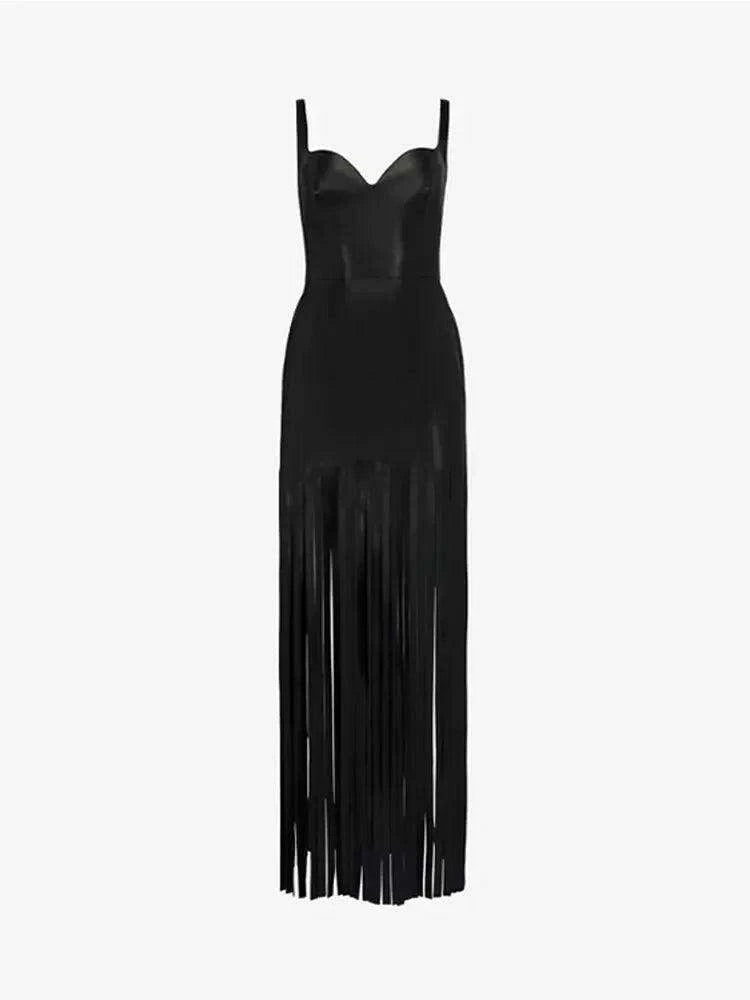 Sleek Black Tassel Patchwork Bodycon Dress - Elegant Backless Gown for Women