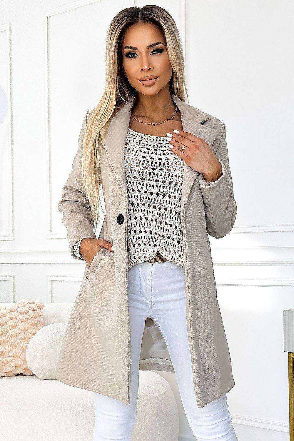 This overcoat stands out from competitors with its elegant design and versatile beige color, making it easy to pair with any outfit. Whether you're dressing up for a special occasion or seeking a chic everyday look, the Chic Beige Button-Up Overcoat is the ultimate choice for any fashion-forward individual. Choose this coat for a blend of style, comfort, and quality that you can trust.