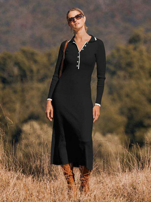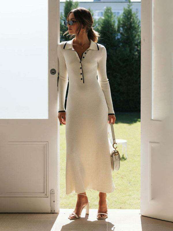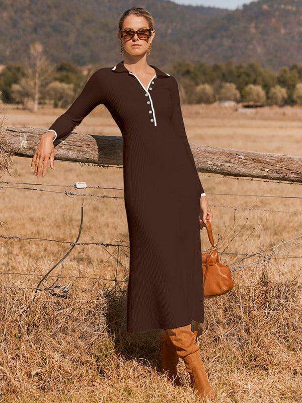 This elegantly crafted dress features a sophisticated lapel neckline and a flattering slim fit that ensures you stand out with confidence. The long sleeves add an element of warmth and sophistication, making it your go-to choice for different weather conditions.