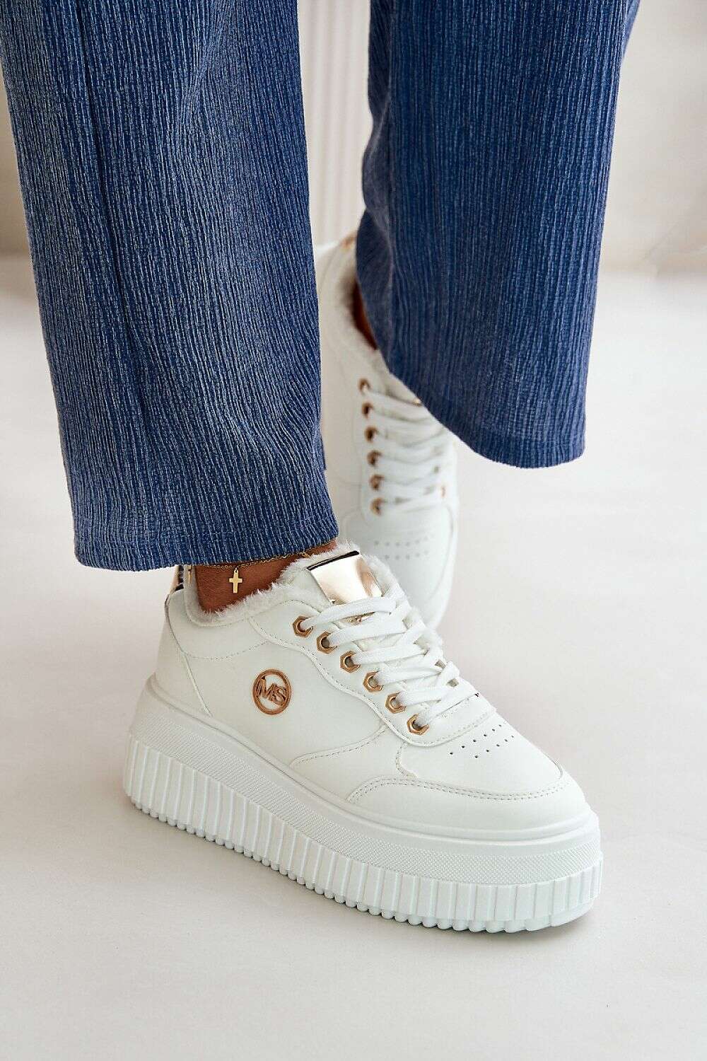 Women's sports shoes made of eco-leather. The massive platform not only lifts the silhouette, but also provides excellent stability. The interior is lined with fur, which provides additional comfort and protection against the cold. The model is classically laced. Perfect for wearing both daily and during outdoor activities.