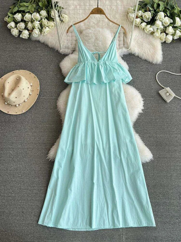 Embrace the summer season with utmost sophistication in our Chic Backless Ruffled A-Line Midi Dress. This exquisite piece effortlessly combines elegance and comfort, making it a must-have for your warm-weather wardrobe.