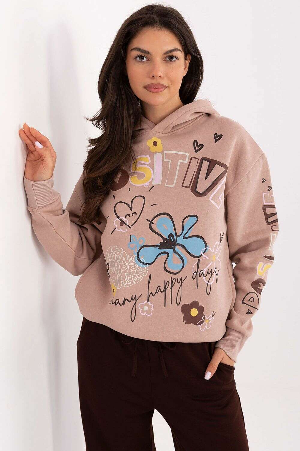 Women's sweatshirt in a casual style, perfect for everyday occasions. Made of a blend of cotton and polyester, it provides comfort and pleasant warmth. A standard length model with long sleeves and practical pockets inserted in the side seams. Character is given by the print with inscriptions covering the entire surface of the sweatshirt, except for the hood, where there is a subtle patch.