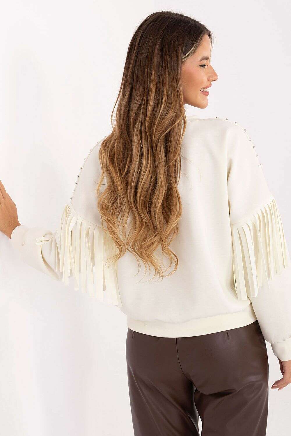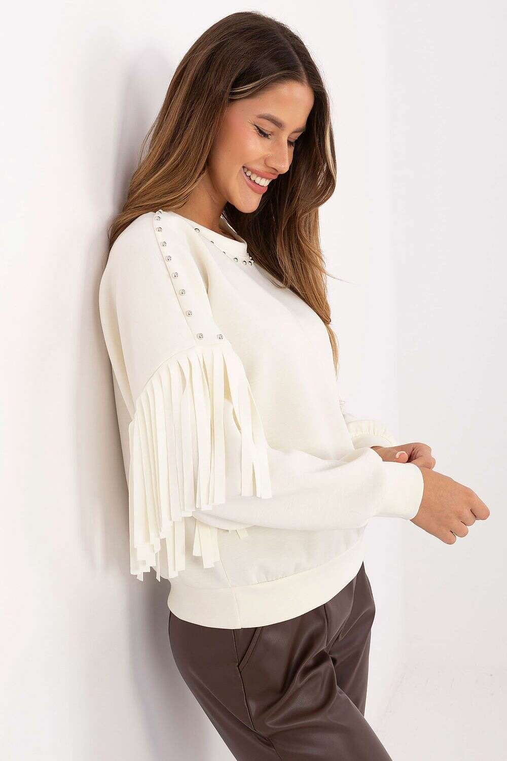 Fabric composition: Polyester 30% and Viscose 70%, delivering a breathable, versatile top that stays comfy from morning to night. The classic round neckline is enhanced with subtle studs for a modern, chic touch, while the long sleeves showcase fringe detailing and stud accents to make this blouse stand out from everyday outfits.