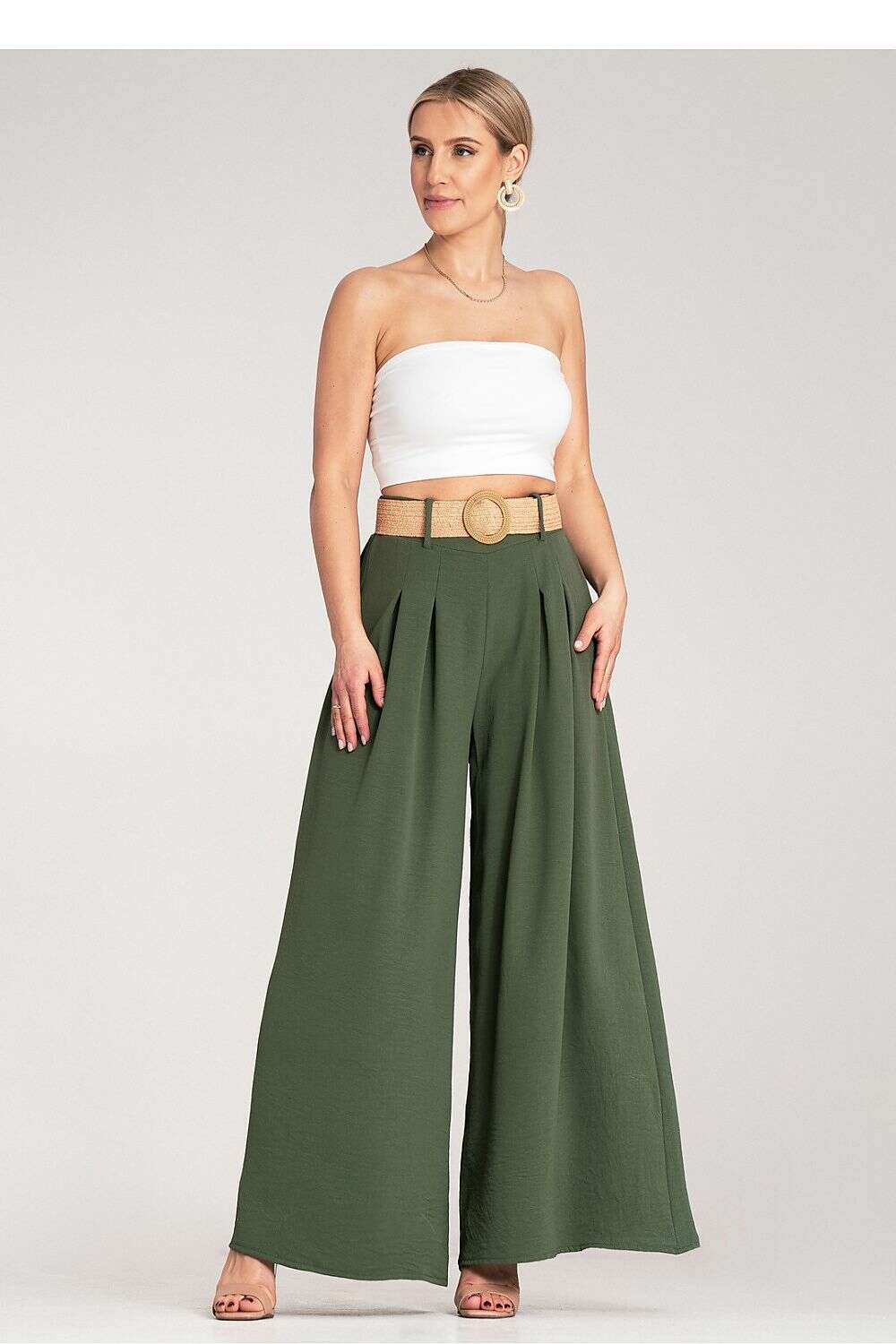 Wide trousers with a high waist and a decorative, woven belt. Lightweight material and loose fit provide comfort, while subtle pleats add elegance.