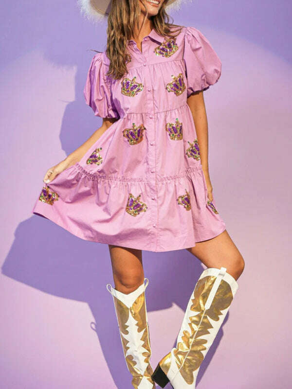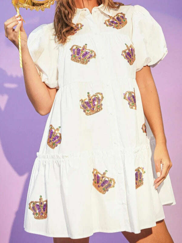 Women's Crown Sequin Puff Sleeve Shirt Dress