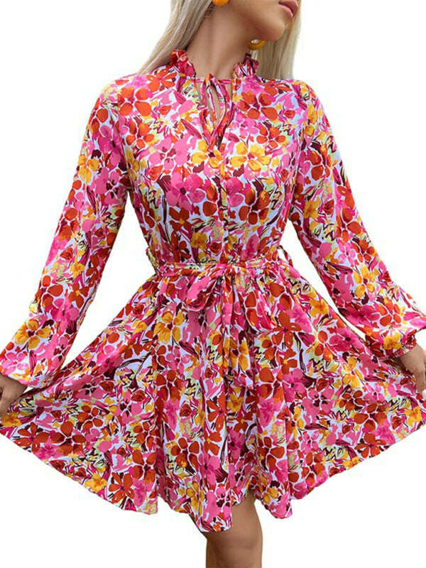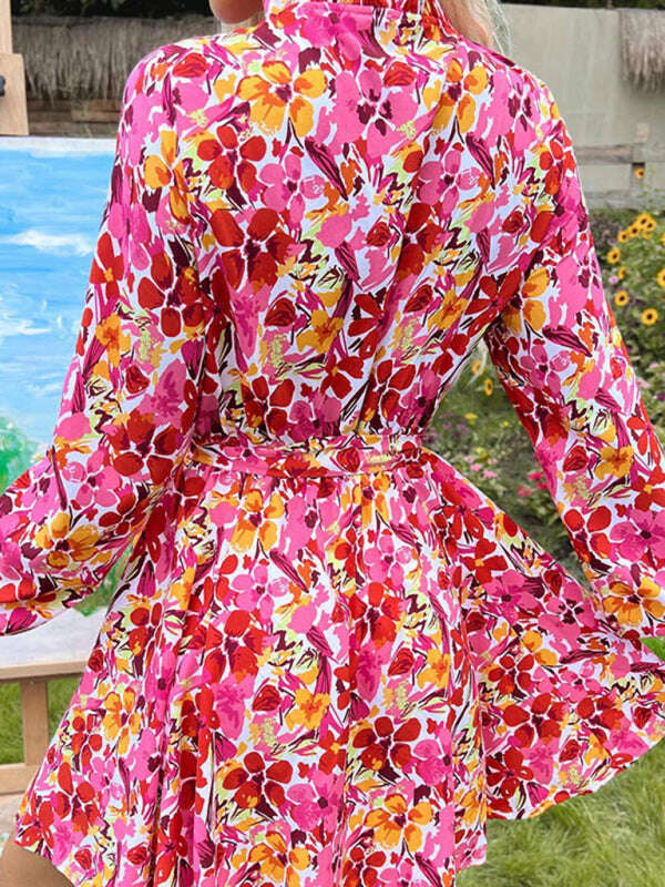 Women's lace-up slim fit lace collar printed dress