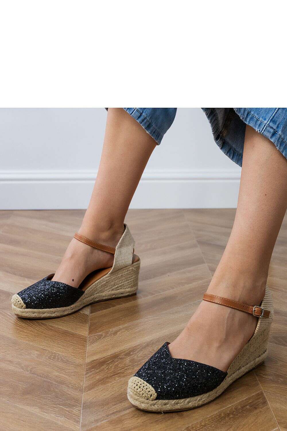 These unique sandals are a combination of summer lightness of espadrilles with the feminine shine of brocade. Made of synthetic material with a brocade finish, they attract attention and add a glamorous effect to any outfit. Perfect for summer parties, holiday strolls, or romantic evenings. The buckle closure allows for a comfortable and secure fit, while the soft insole made of eco-leather guarantees comfort. The 7.5 cm wedge subtly lifts the silhouette, providing stability and walking comfort. A stylish choice for women who like to shine without sacrificing comfort.