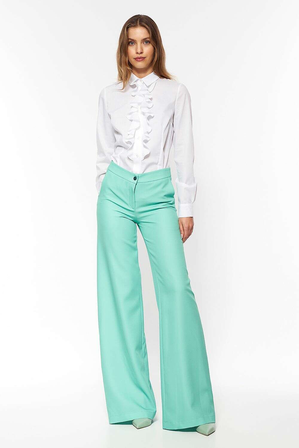 Elevate your wardrobe with the Long Sleeve Shirt Model 216346, a refined piece featuring a delicate ruffled collar that brings feminine charm to both day and night looks. Crafted in a versatile white shade, this shirt pairs effortlessly with distressed jeans, a fitted skirt, or sleek black suede heels for a concert, date night, or weekend outing.