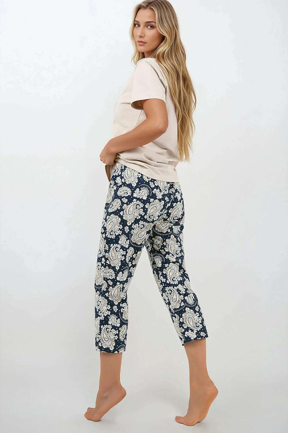 Elegant women's pajamas with a loose, comfortable cut, made of natural materials that provide softness and breathability. The 2-piece set consists of a top with a round neckline and short sleeves, and 7/8 length pants with straight legs and an elastic waistband for a perfect fit. The pajamas do not have pockets, which emphasizes its minimalist, sleek design. A Polish product, designed and sewn with attention to high quality of fabric print and details, guaranteeing comfort and style during relaxation. Composition: Top: 96% cotton, 4% elastane Bottom: 100% cotton