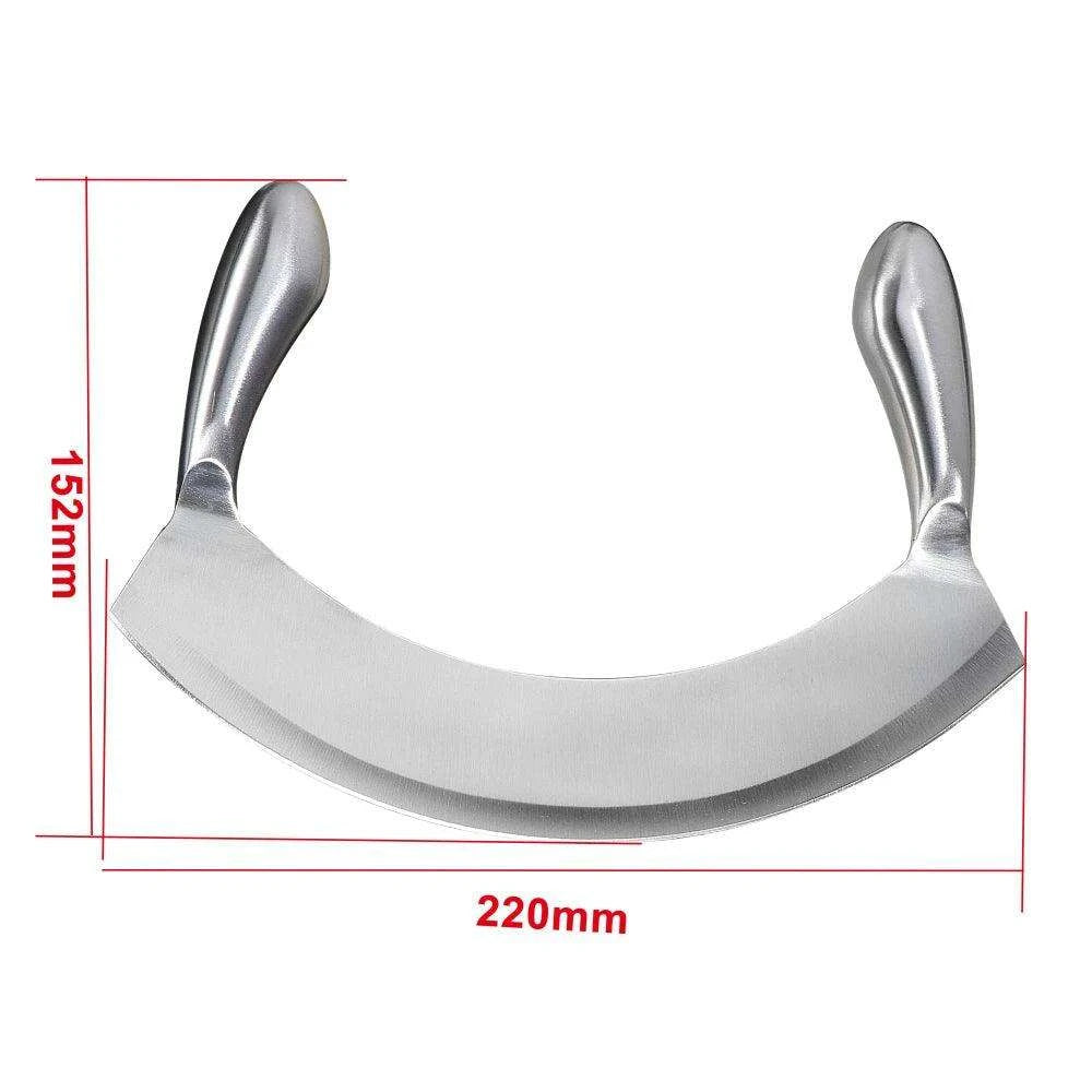 - Premium Materials: The mezzaluna blade is expertly crafted from durable 2cr14 stainless steel, ensuring exceptional longevity and performance. The sturdy 430 stainless steel handle offers a comfortable grip, while the beautiful acacia wood cutting board adds elegance to any kitchen.