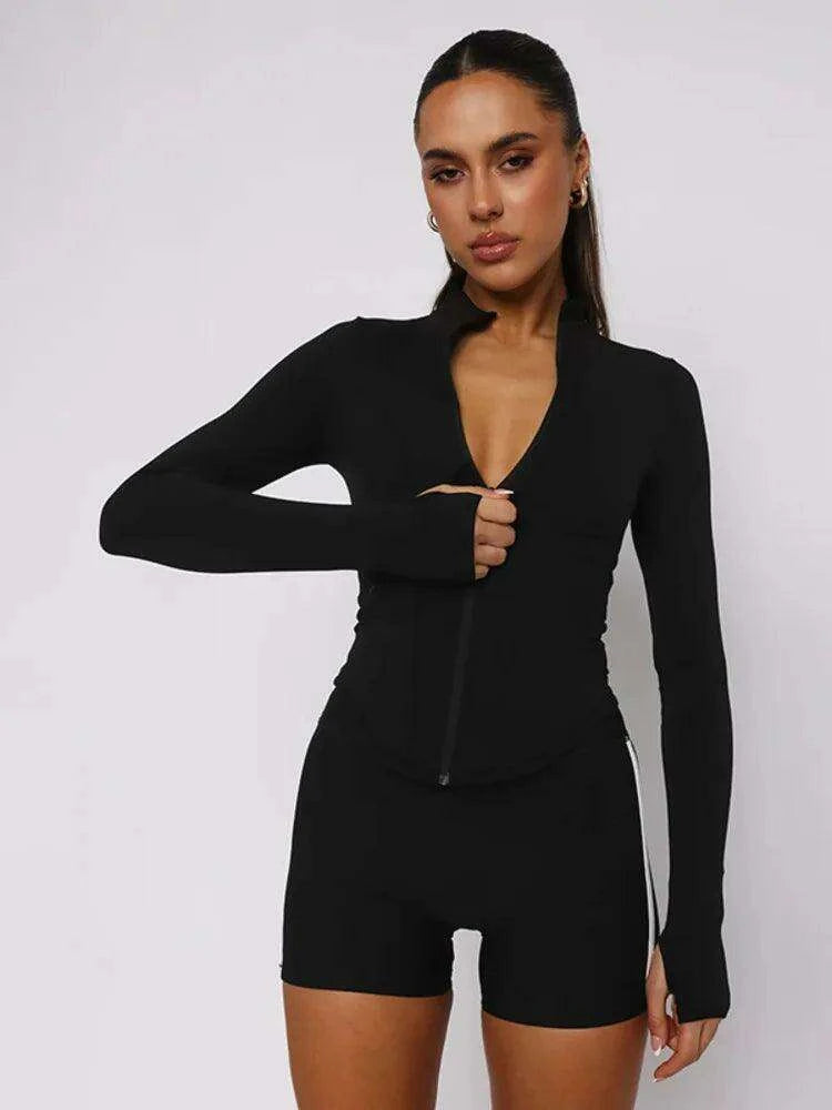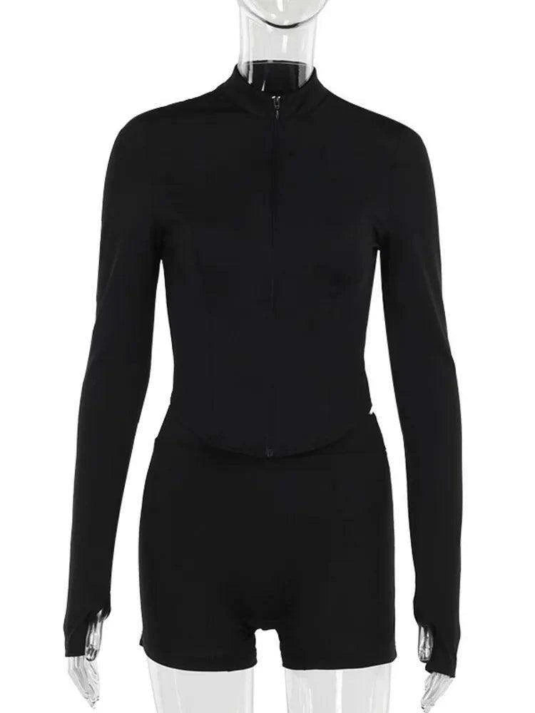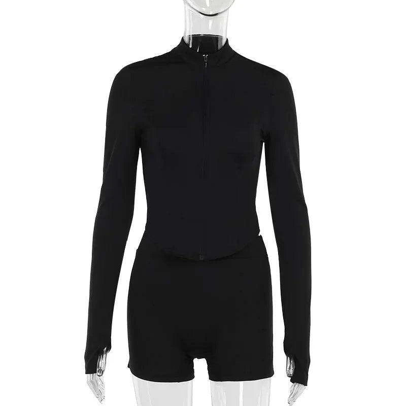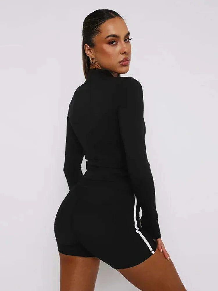 Black Zippered Athletic Tracksuit with Long Sleeve Top and Shorts Set