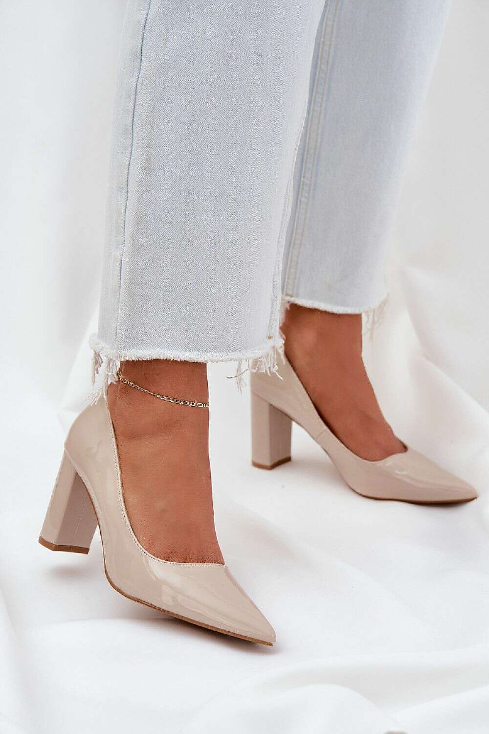 Polished eco leather pumps are an elegant proposal that will add style to any outfit. Set on a block heel, they provide stability and comfort throughout the day. Pointed toes give them a refined character, and the soft insole guarantees wearing comfort. These pumps are a perfect choice for evening outings or formal meetings.