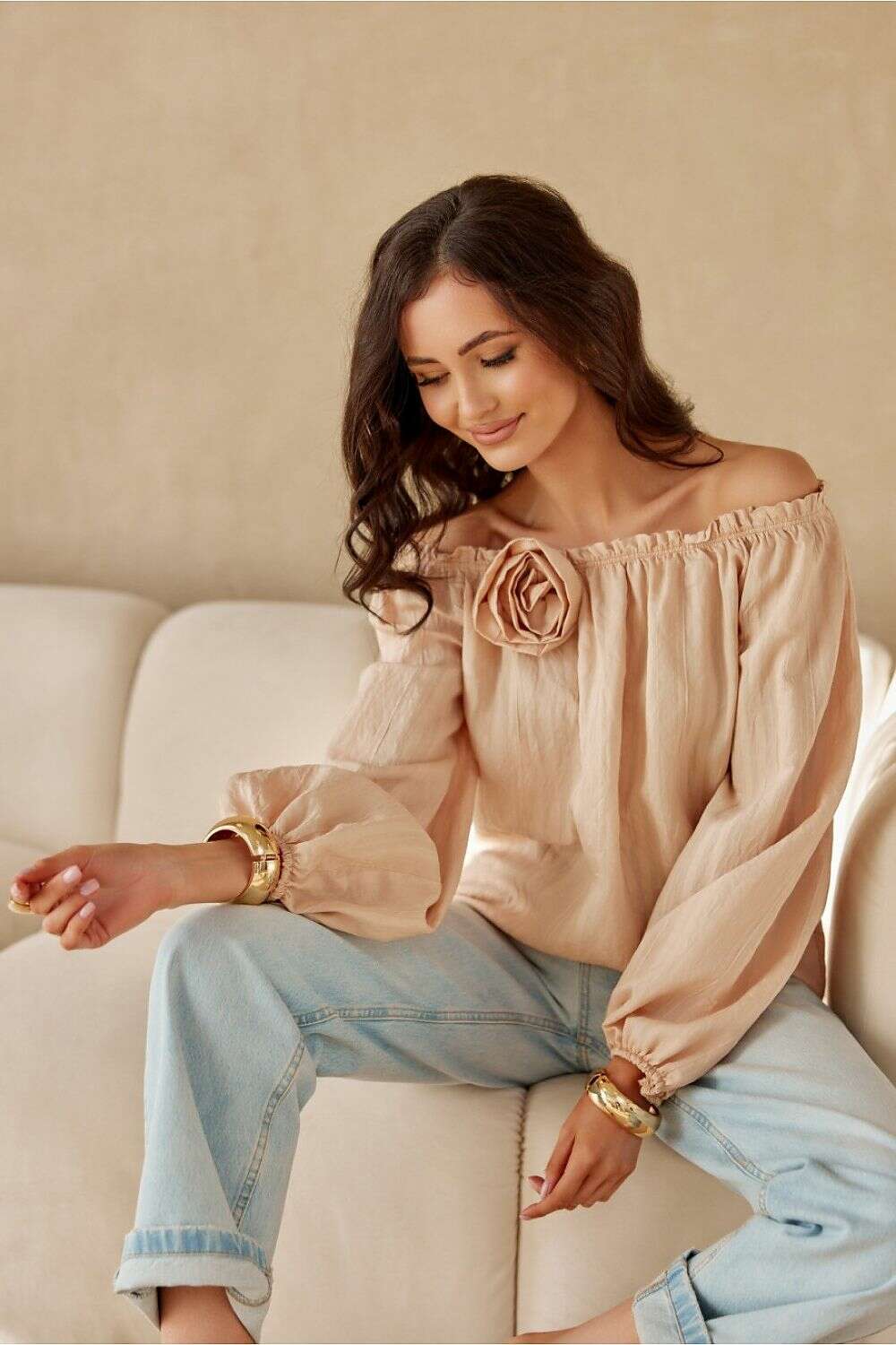 Blouse in the style of a Spanish top with long, puffy sleeves finished with an elastic band. It has an elastic band at the neckline, which allows for adjustment and proper regulation. Decorative rose element.