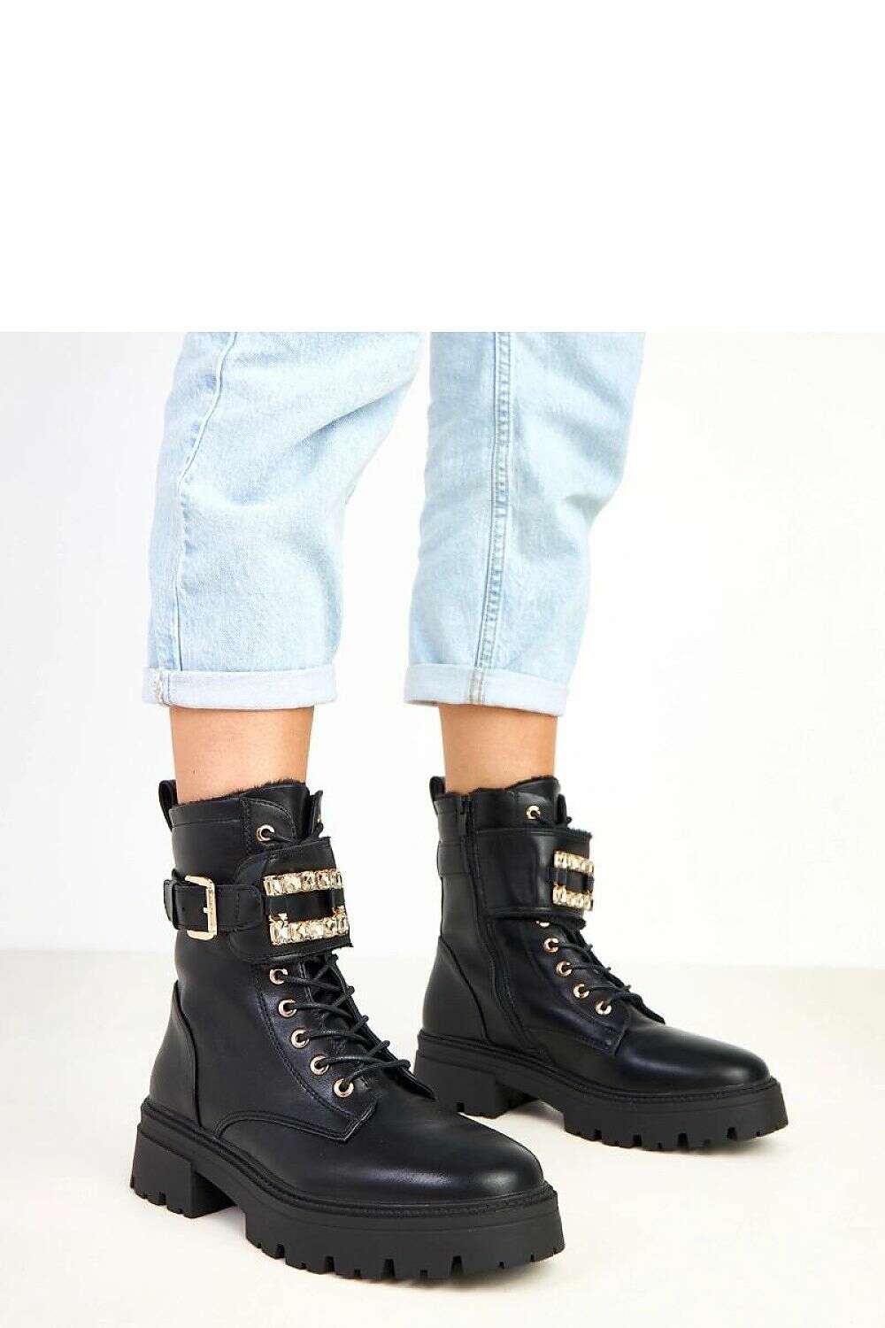 Stylish women's work boots made of high-quality ecological leather, which attract attention thanks to the elaborate decoration with shimmering stones. The model features classic lacing combined with a practical zipper closure, making it easy to put on and adjust to the foot. The shoes have a round toe, a 17-centimeter upper, and a stable flat heel with a solid 4.5-centimeter height, providing comfort and a fashionable look. The interior is finished with soft fabric, ensuring comfort for everyday wear. These stylish work boots with a touch of sparkle are perfect for women who appreciate comfort combined with bold, modern design.
