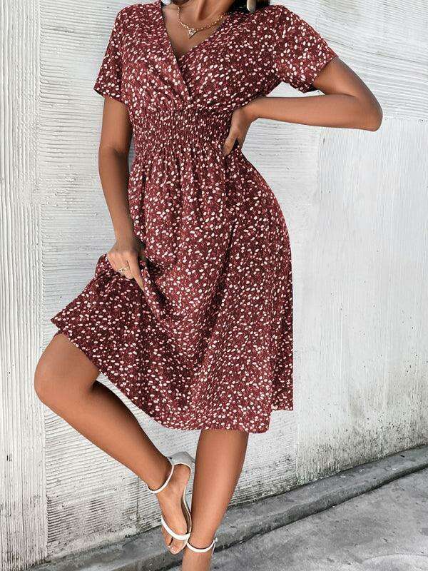 This elegant casual vacation V-neck floral print short-sleeved dress is meticulously designed to keep you cool and stylish. Its flattering silhouette and lightweight fabric make it the perfect companion for your summer adventures, from leisurely beach outings to lively garden parties.