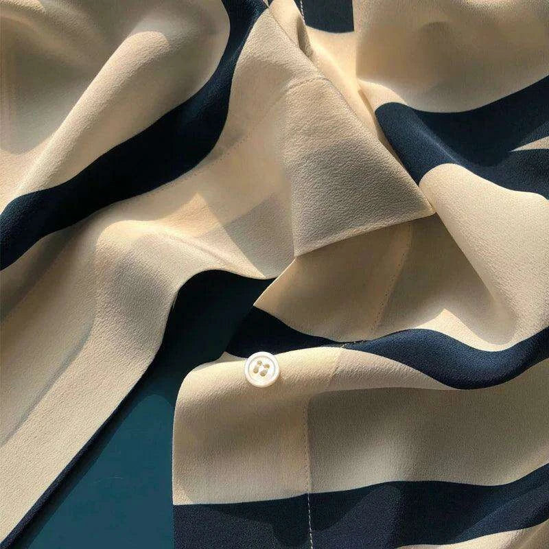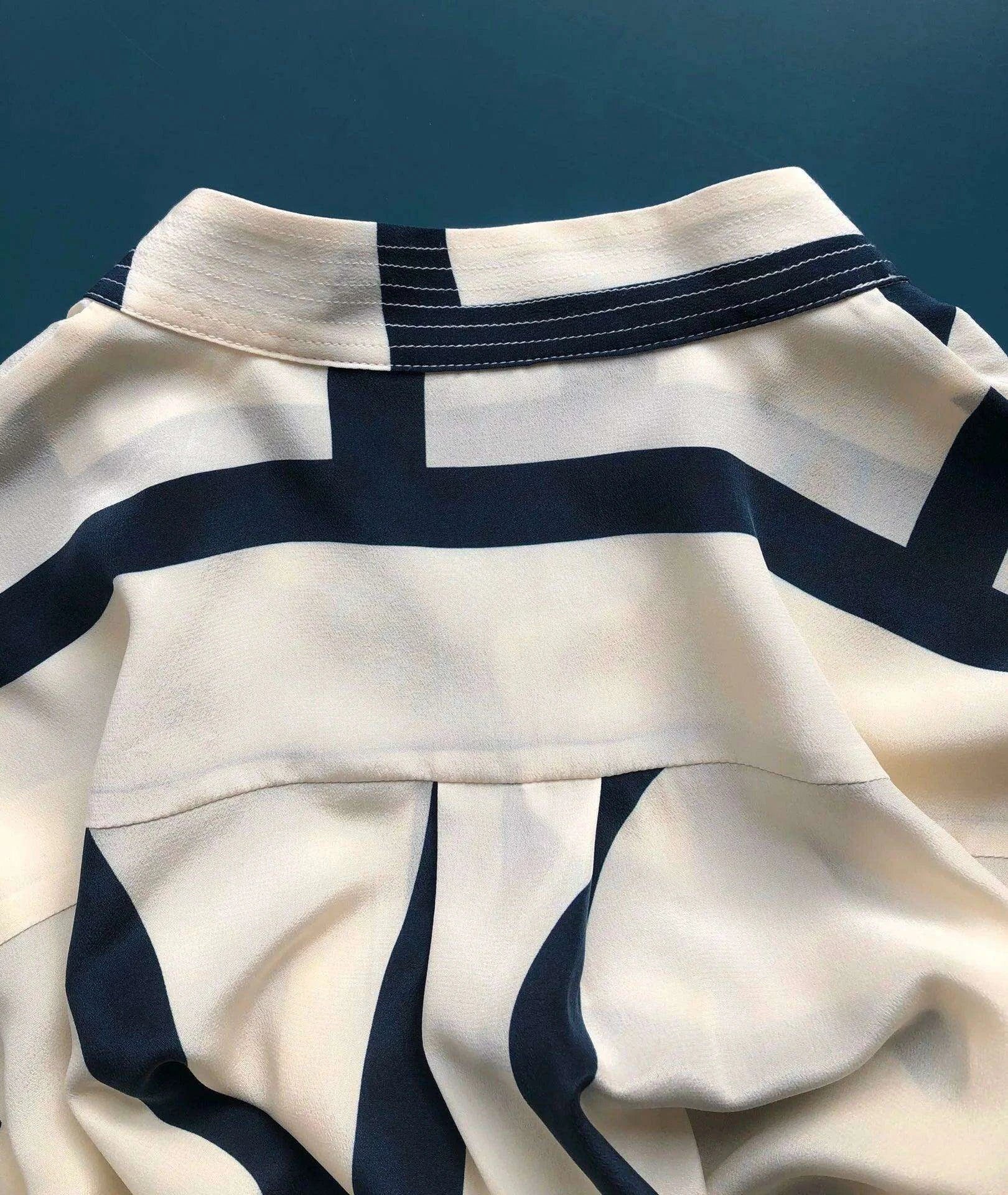 Experience the epitome of luxury with our Chic Geometric Print Mulberry Silk Midi Shirt Dress. Crafted from the finest natural mulberry silk, this dress is designed to provide you with an unparalleled sense of elegance and sophistication.