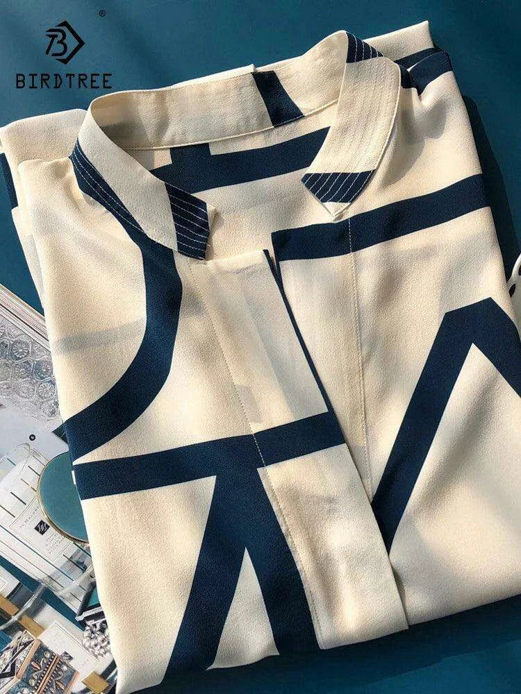 Chic Geometric Print Mulberry Silk Midi Shirt Dress