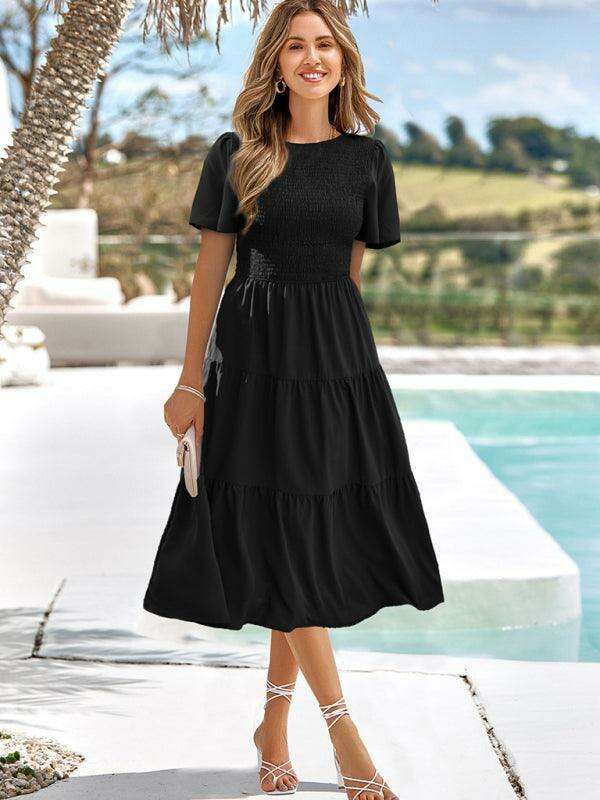 The blend of a classic round neck with elegant pleated details brings a touch of sophistication to your wardrobe. Pair this dress with your favorite accessories to create a chic resort look, or keep it casual with sneakers for a laid-back vibe.
