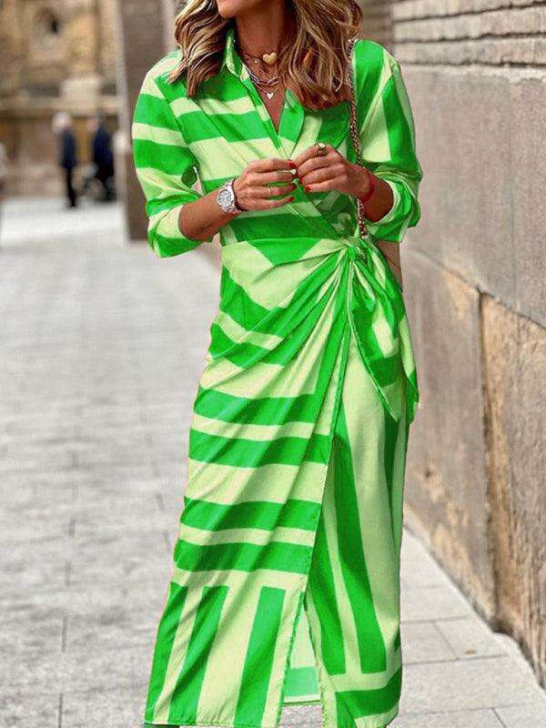 Chic Printed Lantern Sleeve Midi Dress with Tie Slit Detail