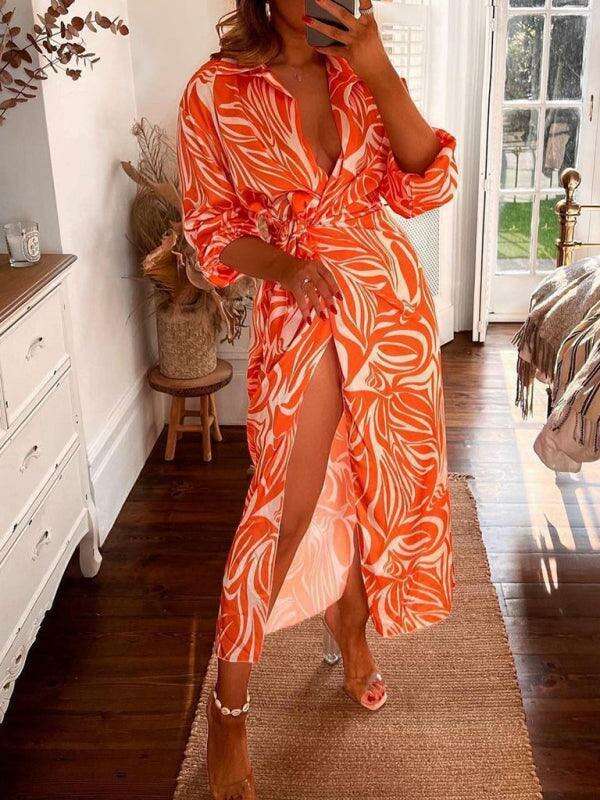 Chic Printed Lantern Sleeve Midi Dress with Tie Slit Detail