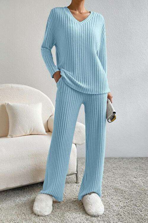 Chic Ribbed V-Neck Lounge Set - Ultimate Comfort Attire