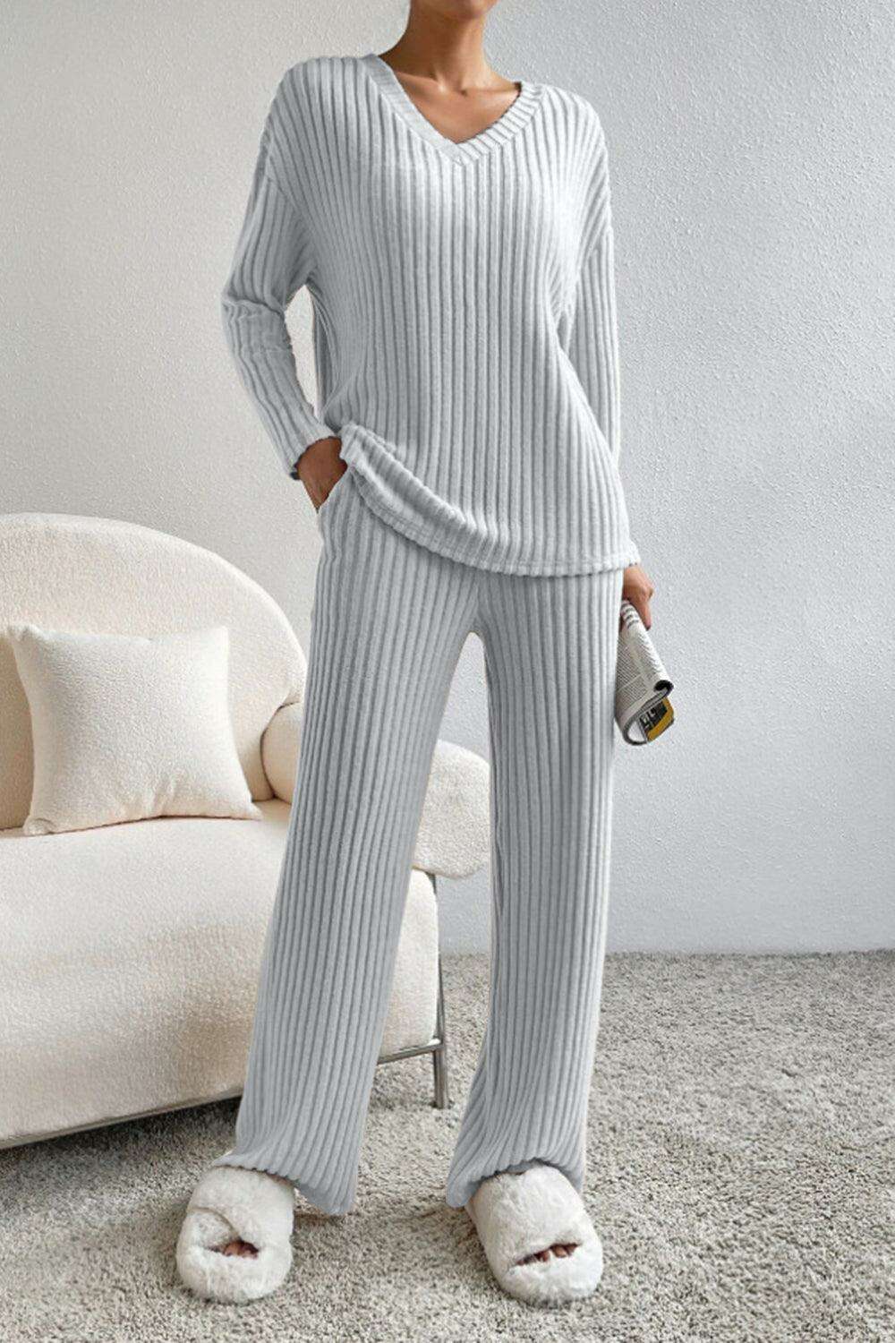 Chic Ribbed V-Neck Lounge Set - Ultimate Comfort Attire