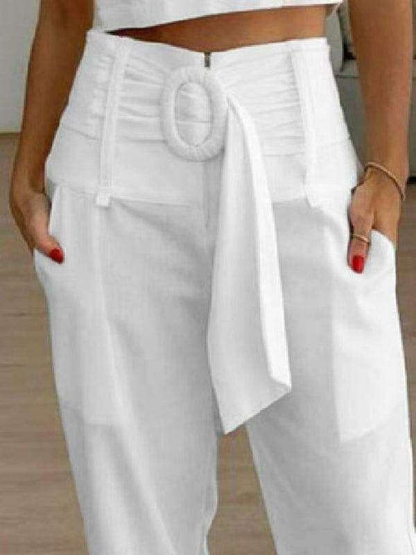 Chic Solid Color Cropped Trousers in Linen and Cotton Blend for Women