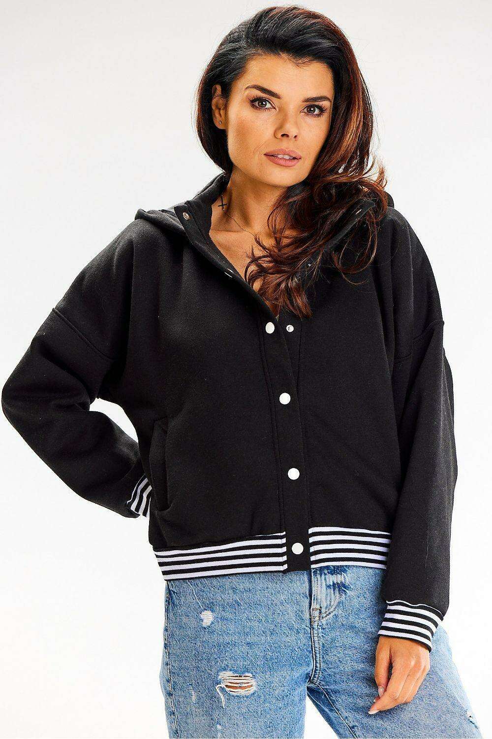 Hooded Striped Ribbed Bomber Sweatshirt with Elegant White Snap Buttons