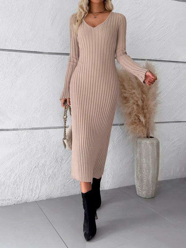Chic V-Neck Knit Dress for Effortless Autumn-Winter Elegance