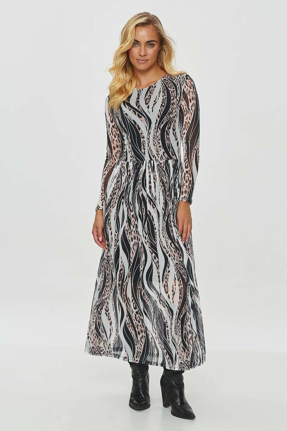 A long printed dress made of light, flowing material, giving it an elegant and romantic look. The dress pattern is a complex mixture of plant, animal, and abstract motifs, with dominant colors of black, white, beige, brown, and shades of orange. The pattern is intricate and original, adding a distinctive style to the creation. The model has a slightly fitted top that accentuates the waist, while the bottom is flared, adding lightness and movement. The finishing of the dress is subtle, and the material is semi-transparent, emphasizing its delicacy. The dress has a viscose lining that discreetly covers strategic areas and ensures comfort while wearing it. When combined with ankle boots, it creates a contrast with the delicacy of the dress, giving the whole outfit a slightly more casual look. The dress is perfect for autumn or winter evenings, thanks to its warm colors and long sleeves. The creation is available in five variants, differing in color and pattern.