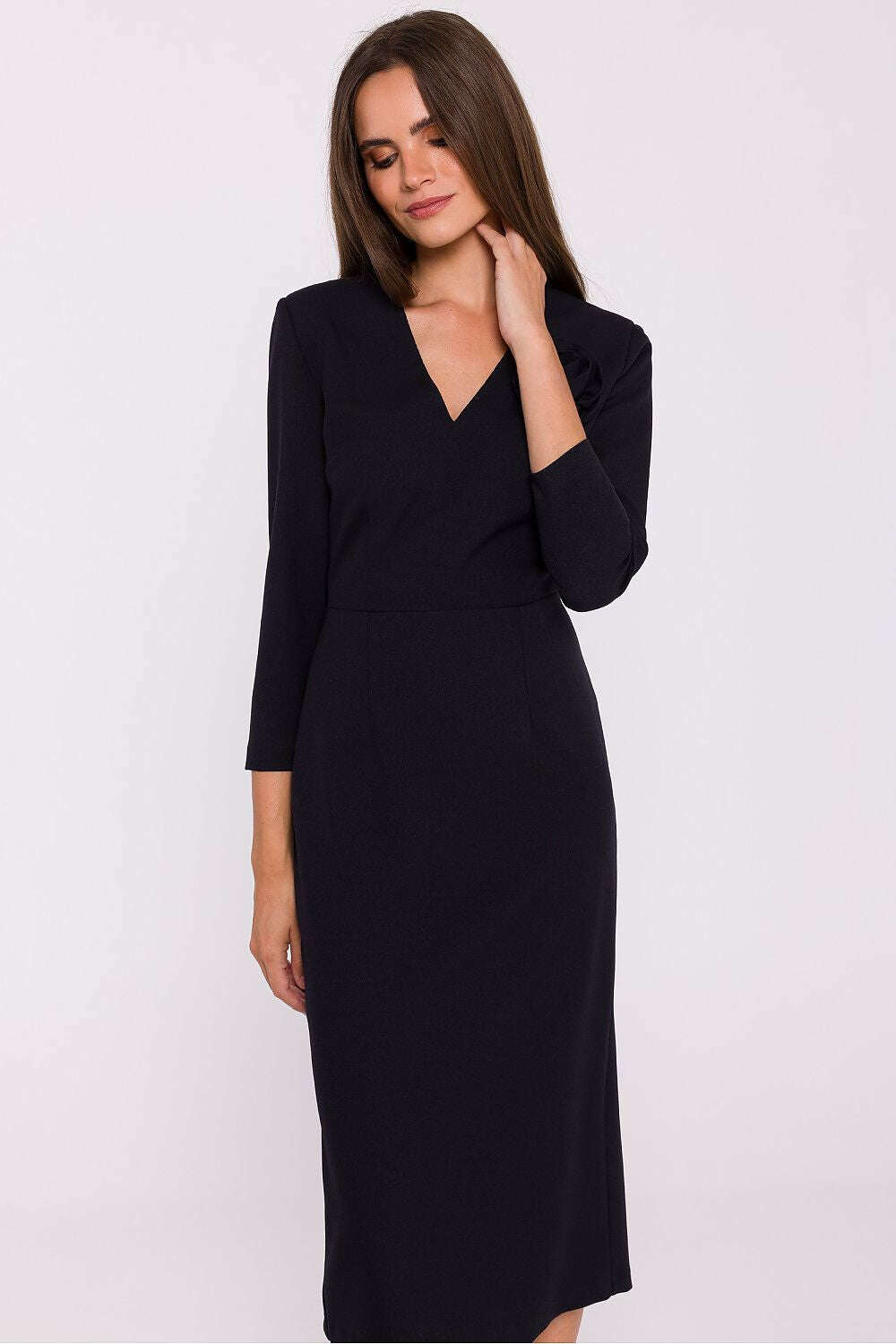 Elegant dress made of fabric with a simple pencil cut, cut off at the waist, which subtly emphasizes the silhouette. The V-shaped neckline adds a chic touch and optically slims the neckline. The midi length provides a classic look, perfect for both formal and casual occasions. The dress is equipped with a covered zipper on the side and a lining, ensuring comfort and a perfect fit. An additional decorative touch is the attached flower on the chest, which adds to its originality. Designed and sewn in Poland, it is an excellent choice for women who appreciate style and elegance.
