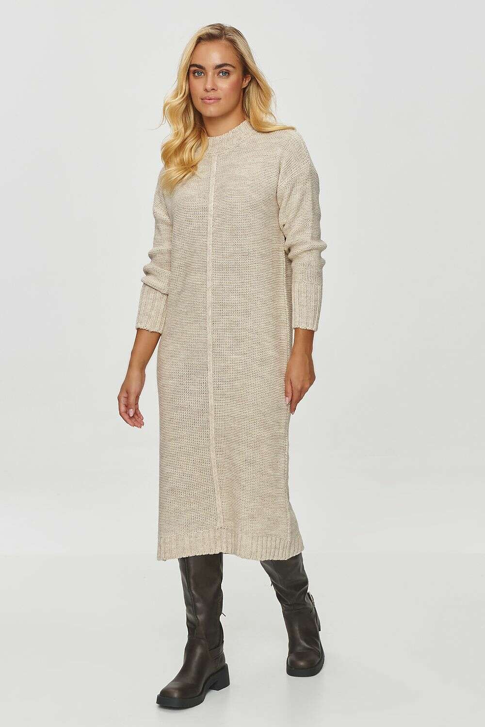 The women's long sweater has a simple, classic cut that reaches below the knees, making it ideal for colder days. It is made of a thicker, fleshy material with a visible knit structure. The top of the sweater has a rounded crew neck, and the sleeves are long and finished with a wide hem, adding extra elegance and warmth. The pattern on the sweater is minimalistic, with no additional embellishments, except for a delicate vertical line running through the center, which optically elongates the silhouette. This sweater is an ideal choice for winter days, combining comfort and style. It can be worn with both high boots and more casual footwear, making it a versatile closet piece.