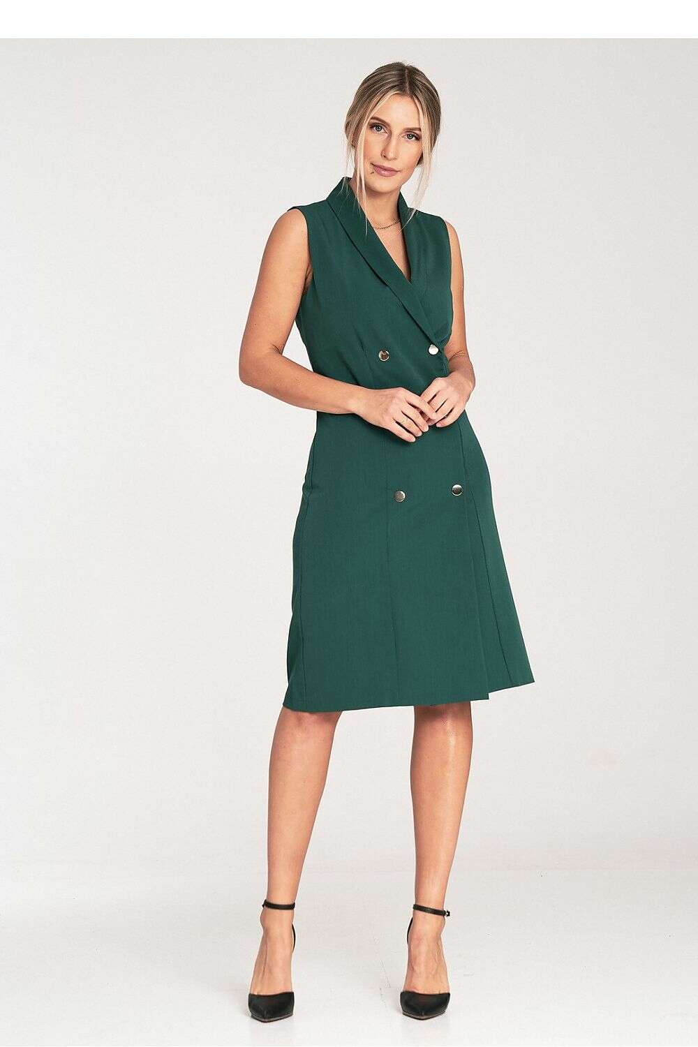 Elegant sleeveless midi dress. Narrow lapels at the front, envelope neckline, double-breasted closure with large decorative snaps. The dress is slightly flared to the bottom.