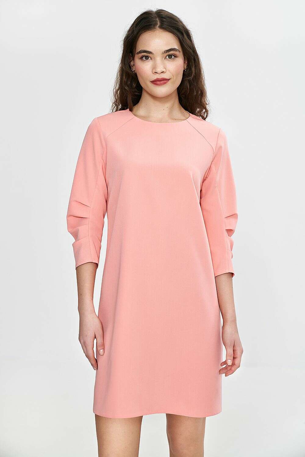 The round neckline provides timeless elegance, while the 3/4 sleeves feature original folds that give the dress a distinctive, contemporary character. The knee-length cut offers easy movement and makes it suitable for various occasions.