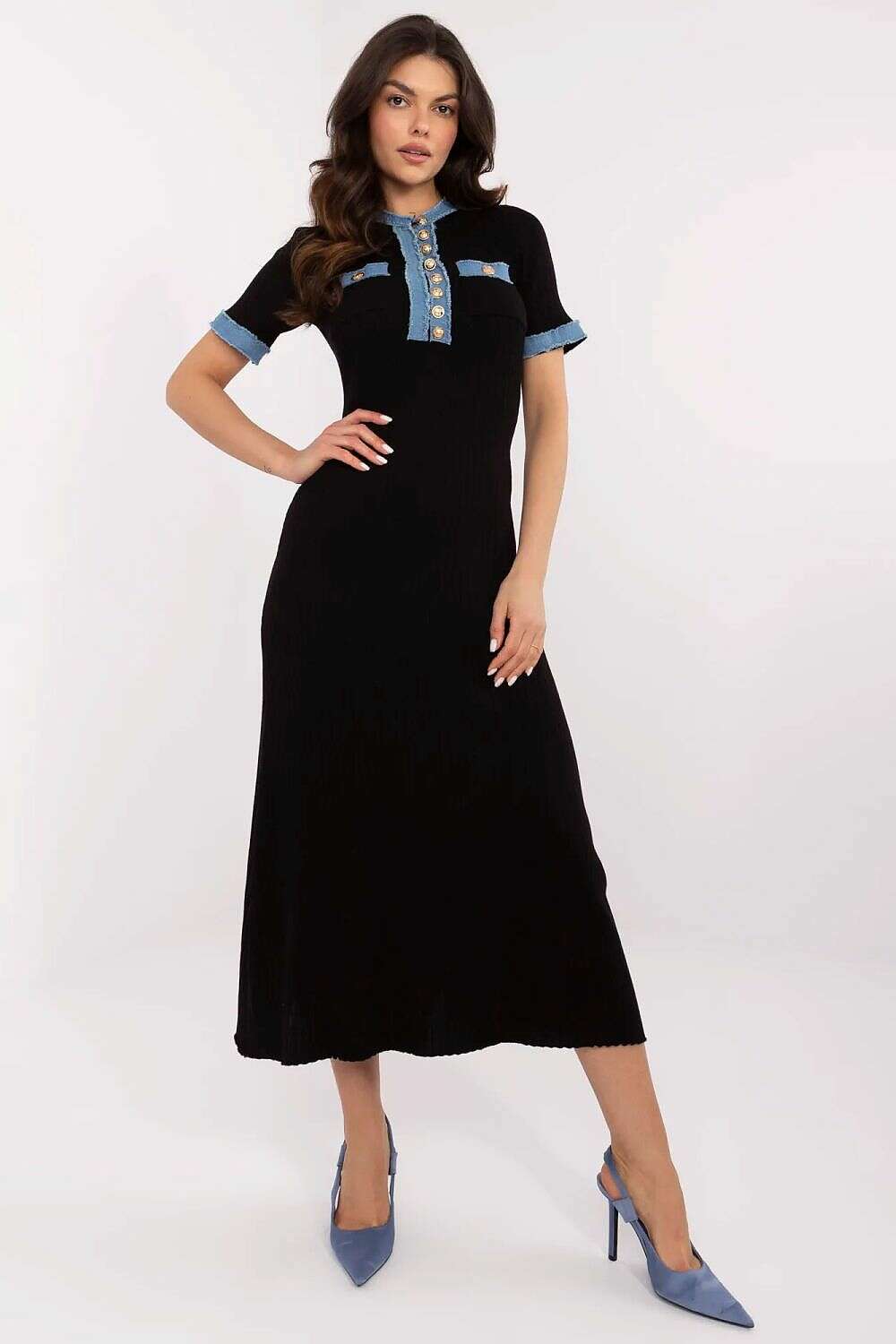 The knitted midi dress is the perfect choice for everyday wear and work. Made from a soft and stretchy blend of viscose and polyamide, it provides comfort throughout the day. The smooth, ribbed material perfectly adapts to the silhouette, emphasizing its advantages. The dress has a classic, round neckline and short sleeves, making it a versatile choice for various occasions. The button closure at the front for a short section adds subtle charm, emphasizing the feminine character of the cut. This timeless proposal will work well both in the office and in everyday stylizations.