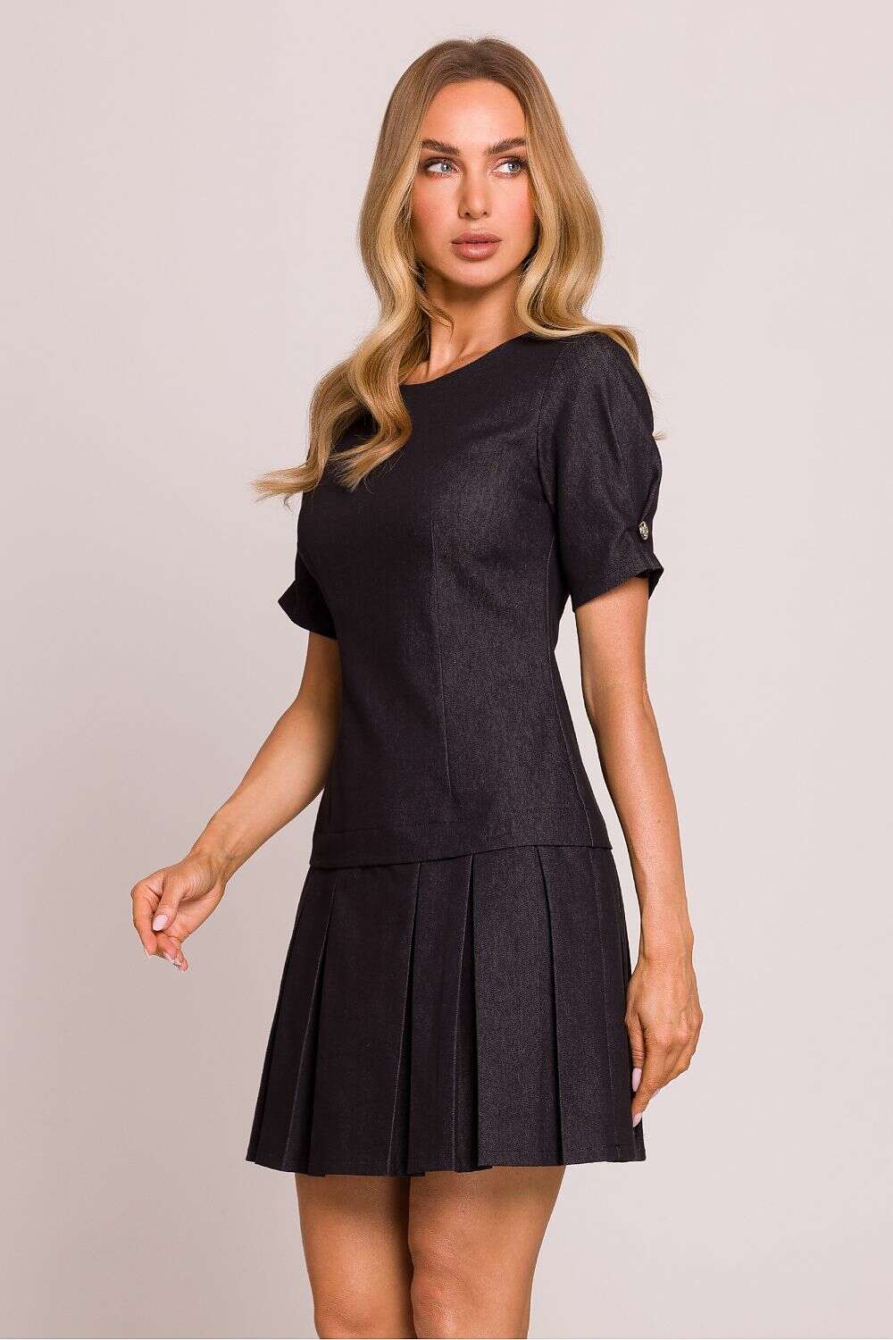 Mini dress made of high-quality cotton fabric, providing comfort and breathability. The style with a lowered waist subtly accentuates the silhouette, while the pleats at the bottom give it lightness and elegance. Short sleeves adorned with darts and decorative buttons add a unique character to the whole. The dress fastens with a hidden zipper at the back, without lining, making it lightweight and comfortable to wear. Designed and sewn in Poland with attention to every detail.