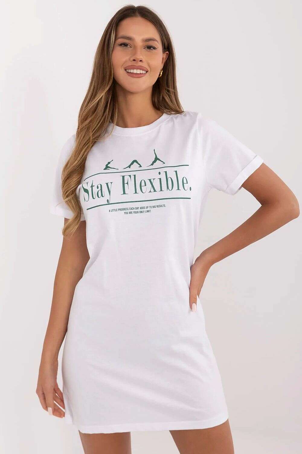 The everyday dress with a simple cut is the perfect combination of comfort and style. Made of soft, breathable cotton, it provides comfort throughout the day. The classic short sleeve and round neckline give it a versatile character, and the knee-length makes it a great choice for everyday wear. The front of the dress is decorated with a trendy print, which adds originality and emphasizes the casual style. It pairs well with sneakers, sandals, or sneakers, creating a light and casual outfit for any occasion.