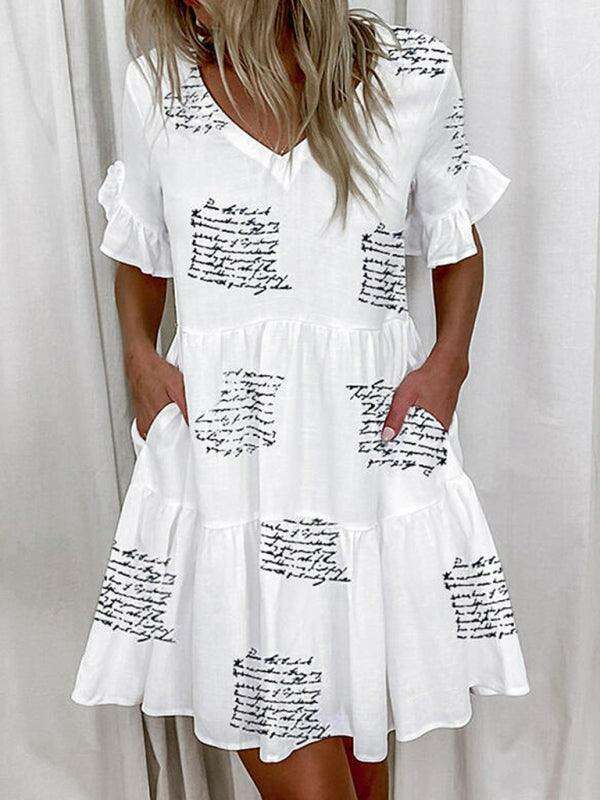 Chic V-neck Printed Ruffle Pocket Dress for Effortless Elegance