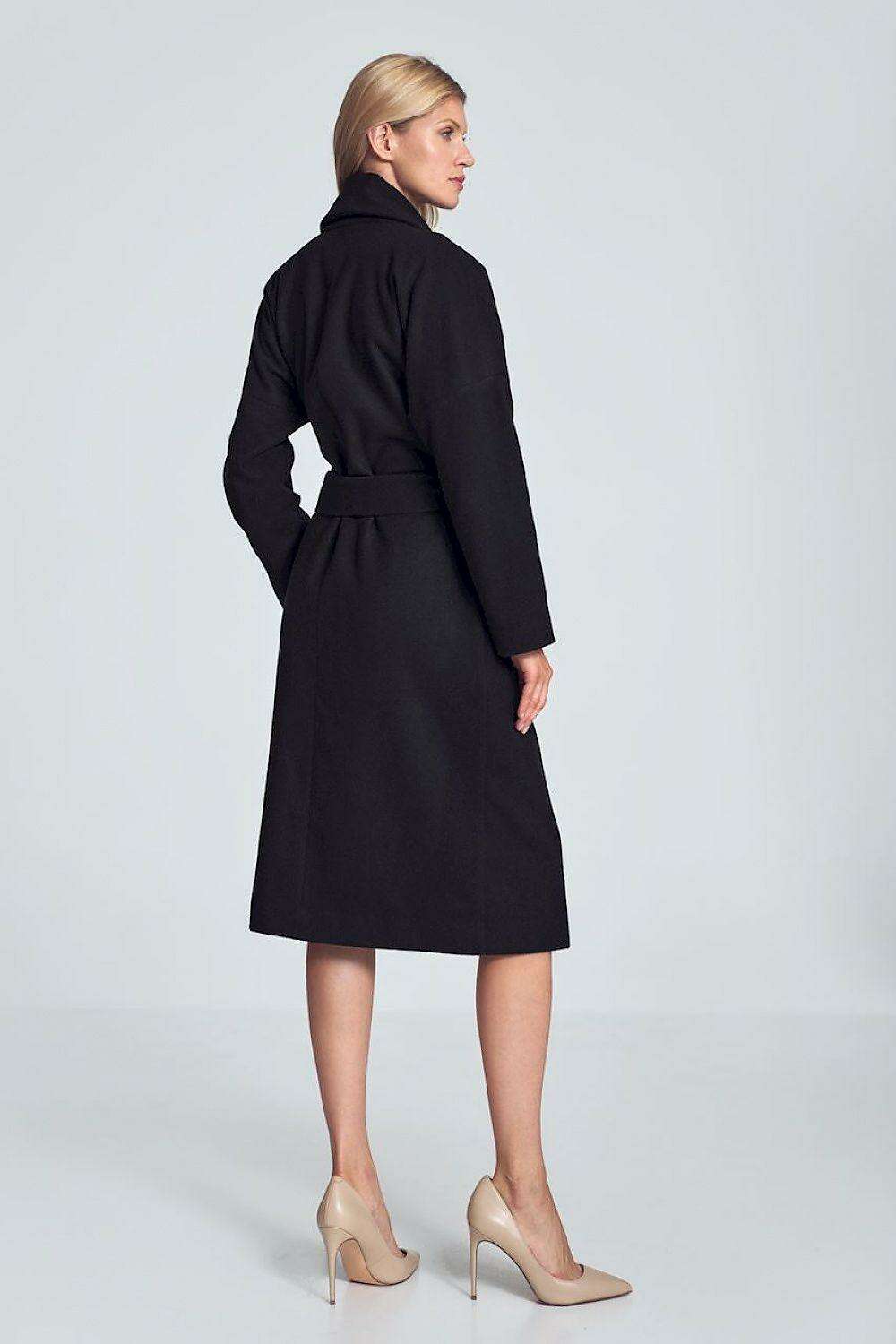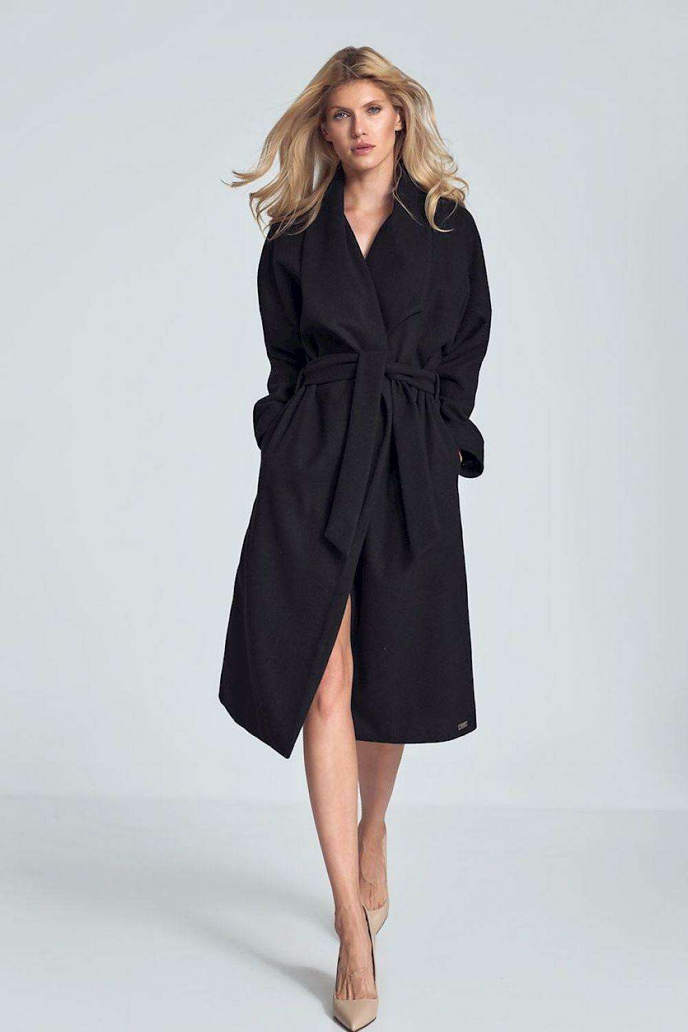 Elegant Black 7/8 Length Coat with Oversized Collar and Waist Tie